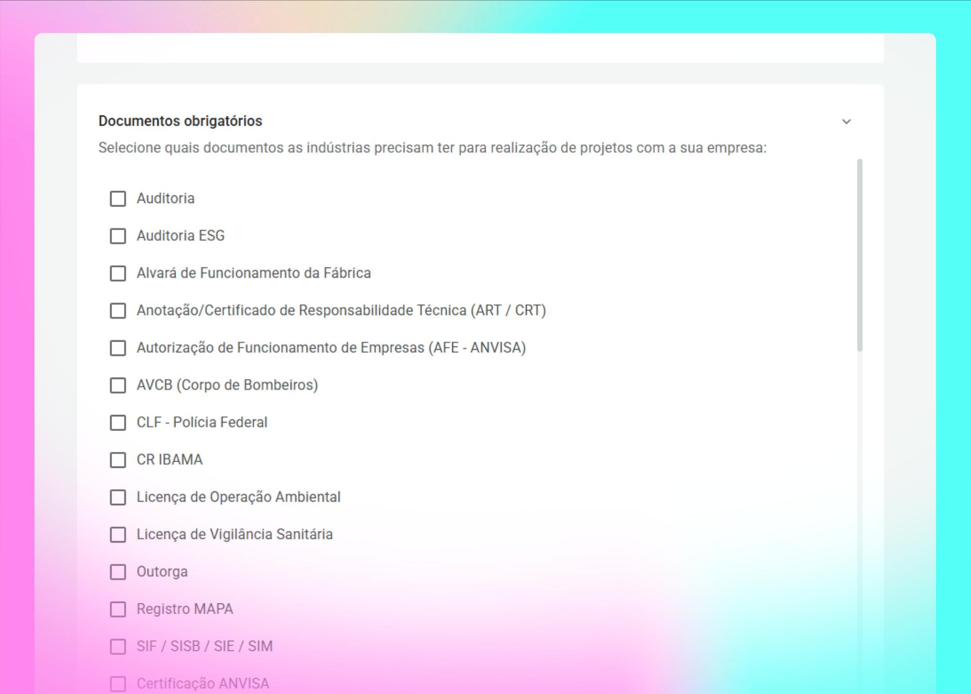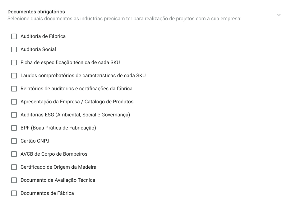 Os varejistas passam a ter autonomia para configurar quais documentações são exigidas de indústrias em seus projetos. Essa definição centralizada ajuda a tornar o processo de seleção de indústrias mais eficiente e alinhado com os critérios específicos de cada negócio.