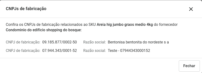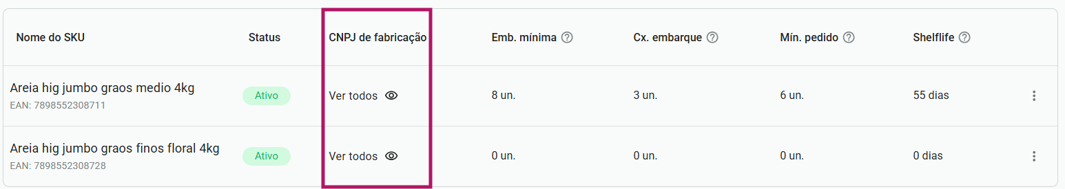 Agora, ao acessar a tela Meus SKUs, o varejo passa a visualizar os CNPJs e as Razões Sociais das unidades fabris vinculadas diretamente ao produto.