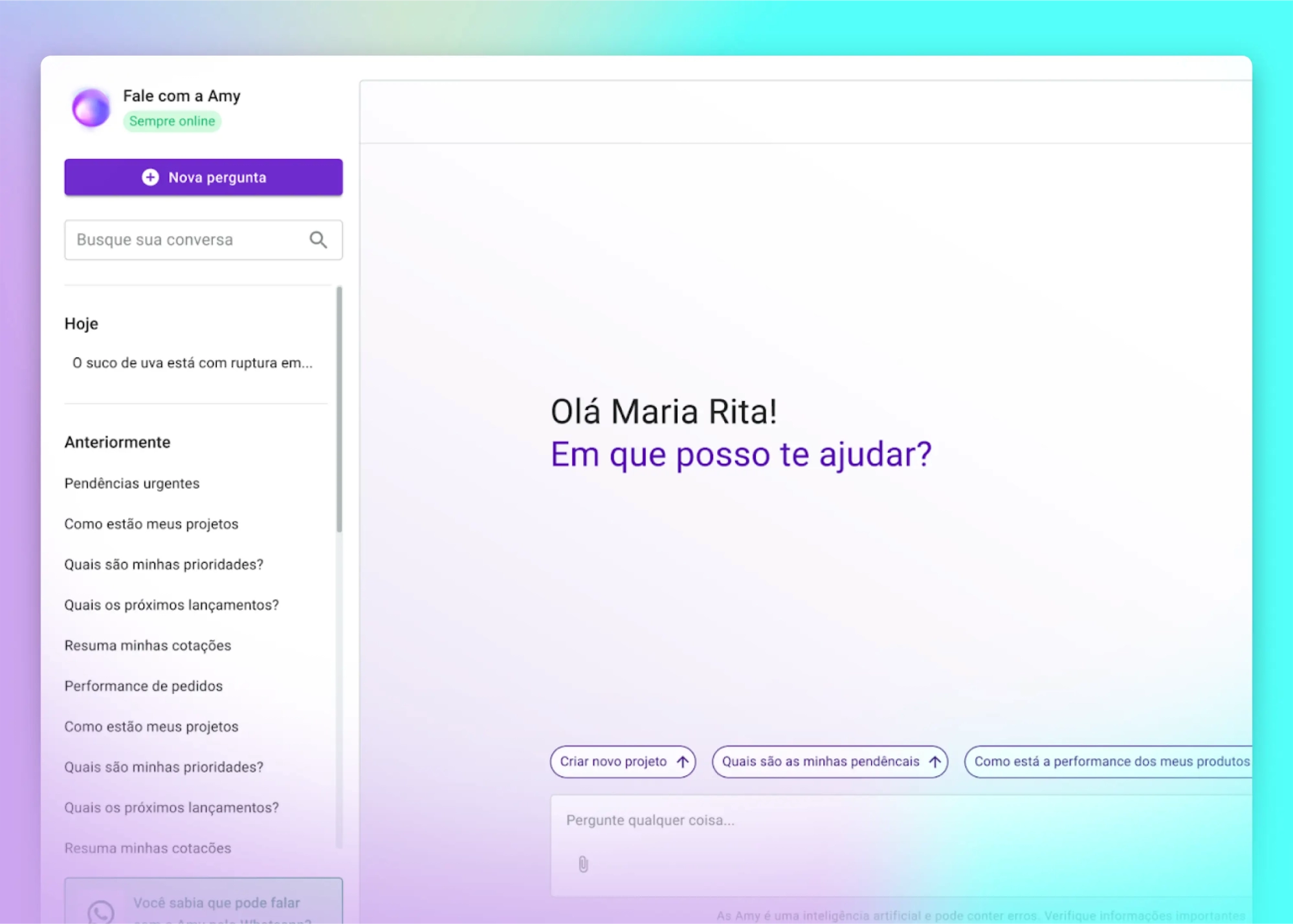 Apresentamos a nova Amy, a evolução da nossa Inteligência Artificial, criada para ser sua parceira estratégica em todas as jornadas de marca própria – tanto para o Varejo quanto para a Indústria. A Amy agora te acompanha de forma inteligente e centralizada, transformando as expectativas em resultados concretos.