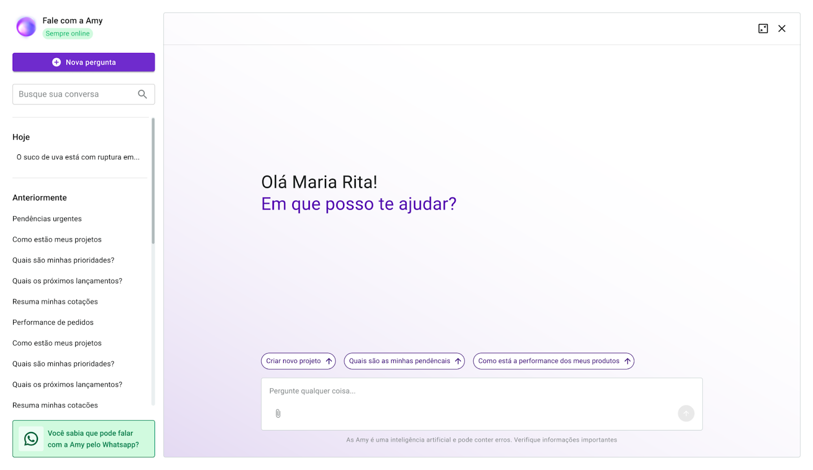 - Criação de Projetos em Segundos: Chega de achismos. A Amy utiliza a integração de dados para recomendar o volume de projetos com base na sua média de vendas da categoria, além de sugerir marcas que podem ser eliminadas.