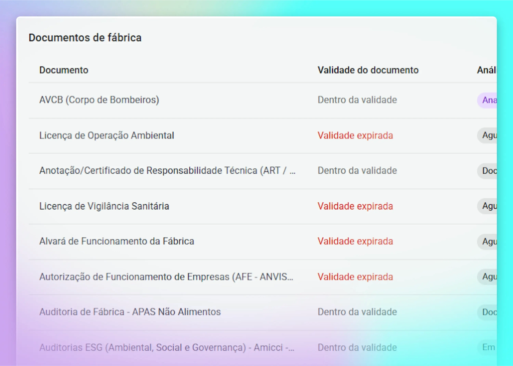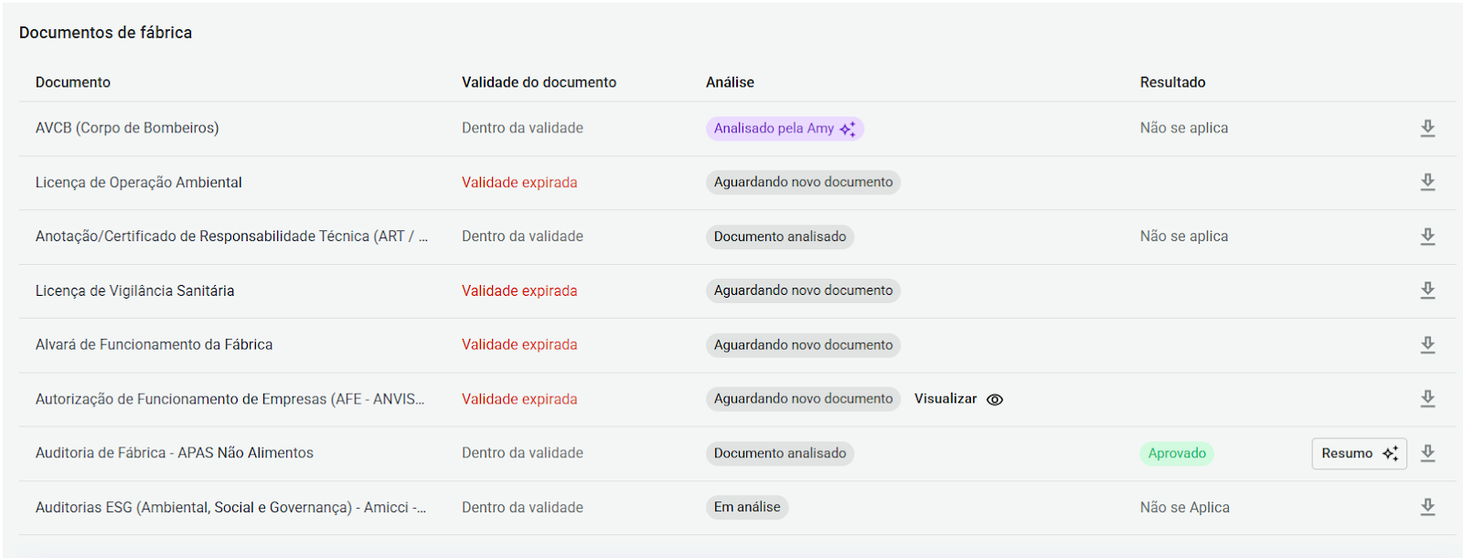 Ficou mais fácil entender o que está pendente, o que foi analisado e o que já está aprovado na área de documentos de fábrica.